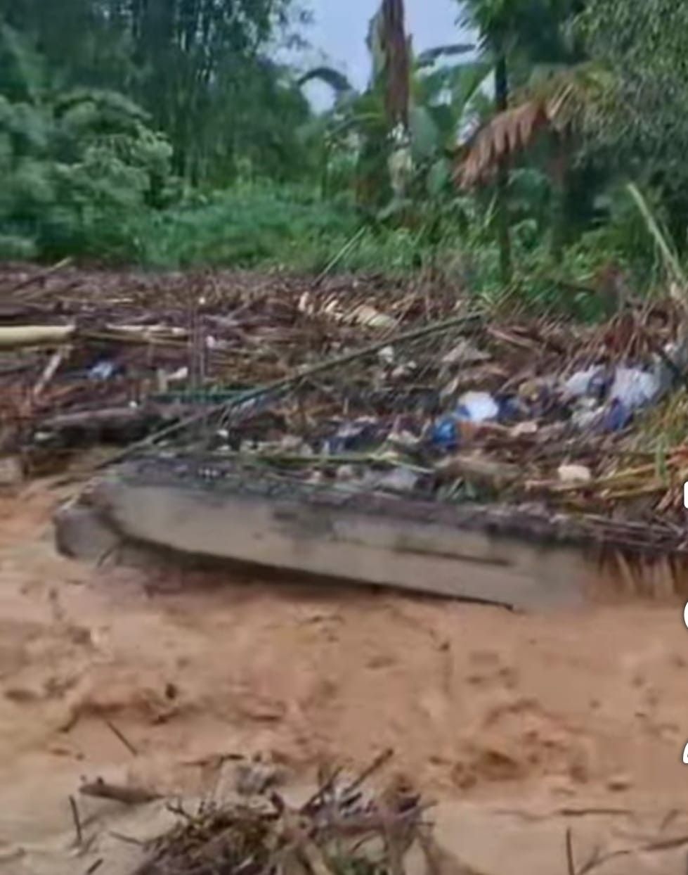 Kondisi jembatan di Desa Blang Padang, Tangan-Tangan telah disesaki sampah dan kayu-kayu ranting diseret arus sungai.