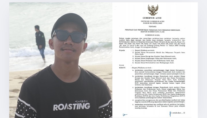 Desakan ini disampaikan menyusul terbitnya Instruksi Gubernur Aceh Nomor 08/INSTR/2025 tentang Penataan dan Penertiban Perizinan/Non Perizinan Berusaha Sektor Sumber Daya Alam, yang menegaskan pentingnya tindakan konkret pemerintah kabupaten dalam memastikan kepatuhan hukum dan tata kelola sumber daya alam (SDA) yang berkelanjutan.
