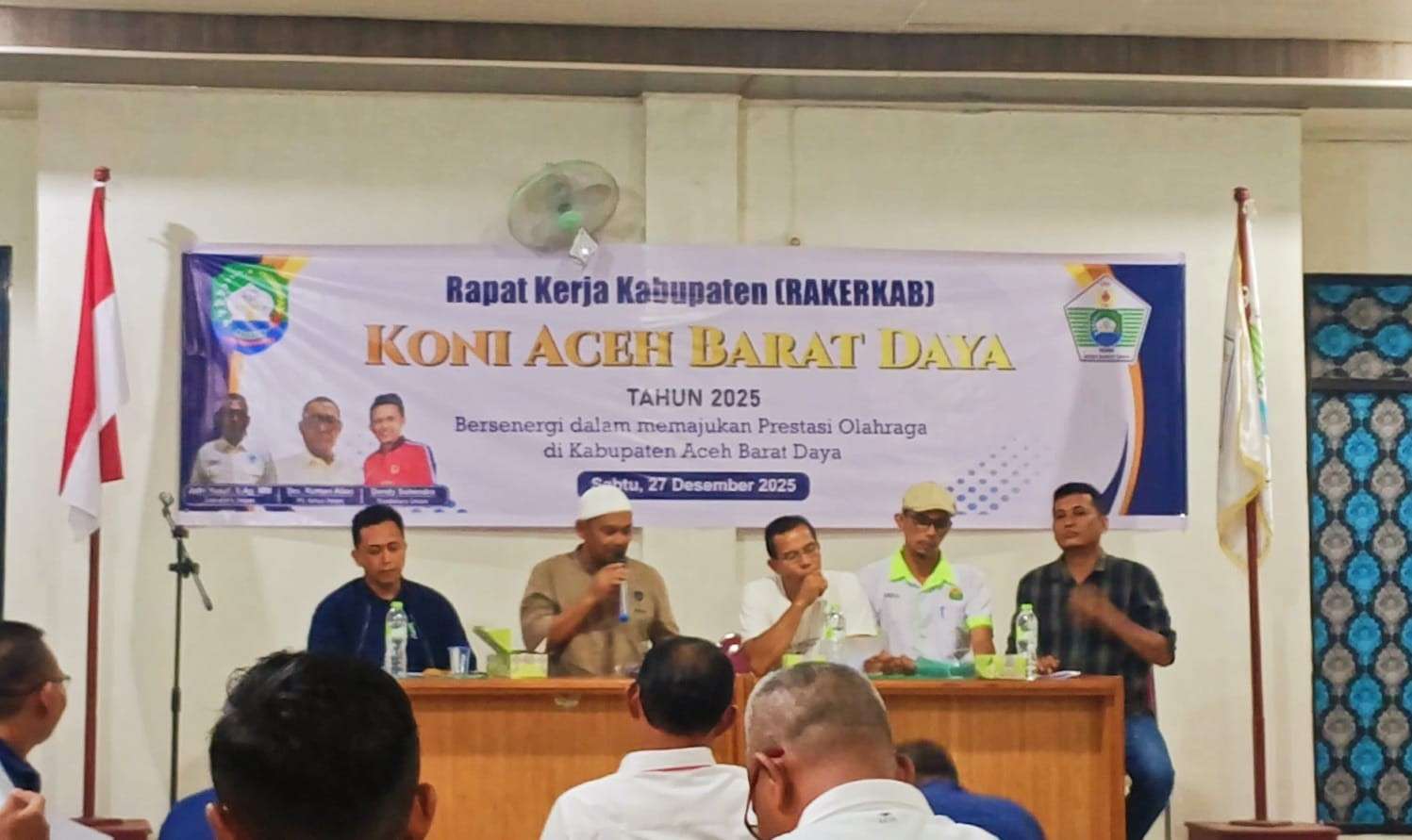 ASPIRATIF.ID – Komite Olahraga Nasional Indonesia (KONI) Kabupaten Aceh Barat Daya (Abdya) menggelar Rapat Kerja Kabupaten (Rakerkab) dalam rangka persiapan Musyawarah Olahraga Kabupaten Luar Biasa (Musorkablub) pemilihan Ketua KONI yang berlangsung di Aula Kantor Desa Gampong Geulumpang Payong, Kecamatan Blangpidie, kabupaten setempat, Sabtu malam (27/12/2025).