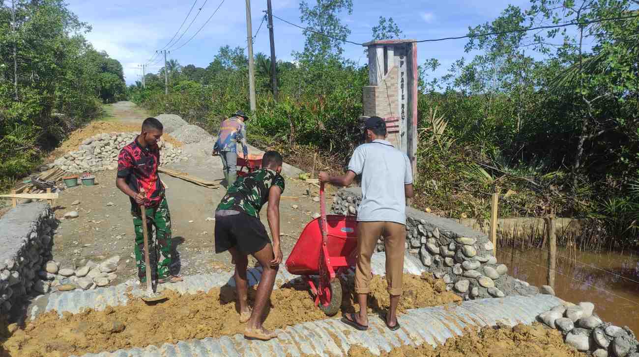 Di bawah terik matahari, personel TNI bersama masyarakat setempat bahu-membahu melaksanakan penimbunan dengan semangat gotong royong.